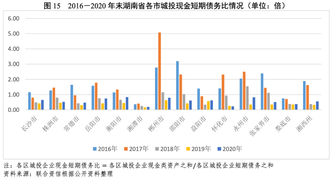 從湖南省各地級市發(fā)債城投企業(yè)貨幣資金對短期債務(wù)的覆蓋情況來看,2016-2020年末,除長沙市外,各地級市發(fā)債城投企業(yè)貨幣資金對短期債務(wù)的覆蓋程度均呈不同程度的下降,反映出湖南省各地級市發(fā)債城投企業(yè)整體流動性壓力較大。截至2020年底,湖南省各地級市(除懷化市外)現(xiàn)金短期債務(wù)比均較上年底小幅上升,流動性壓力有所緩和,但仍相對較大。具體看,截至2020年底,湘潭市城投企業(yè)貨幣資金/短期債務(wù)倍數(shù)不足0.20倍,為省內(nèi)各地級市中最低,湘潭市發(fā)債城投企業(yè)短期流動性壓力在省內(nèi)各地級市中排名仍靠前。
