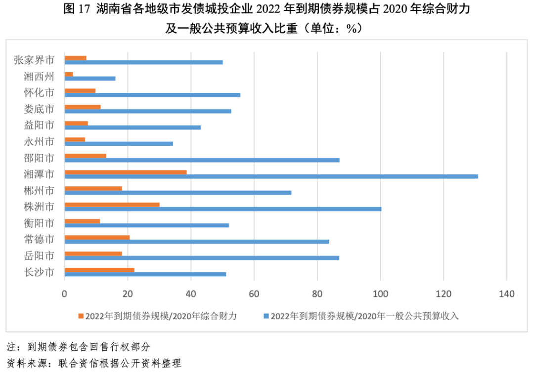 從一般公共預(yù)算收入以及綜合財力對2022年到期債券的覆蓋情況看,各地級市中2022年到期債券規(guī)模/2020年綜合財力比值較高的為湘潭市、株洲市、長沙市和常德市,分別為38.66%、30.11%、22.09%和20.62%。湘潭市、株洲市、長沙市和常德市2022年城投企業(yè)債券兌付壓力相對較大。