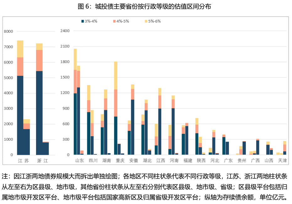 ①江浙兩地多為區縣級平臺(含市級開發區平臺),地市級平臺債券較少(多為估值3%以下債券),省級平臺因收益率基本在3%以下未在圖中;
