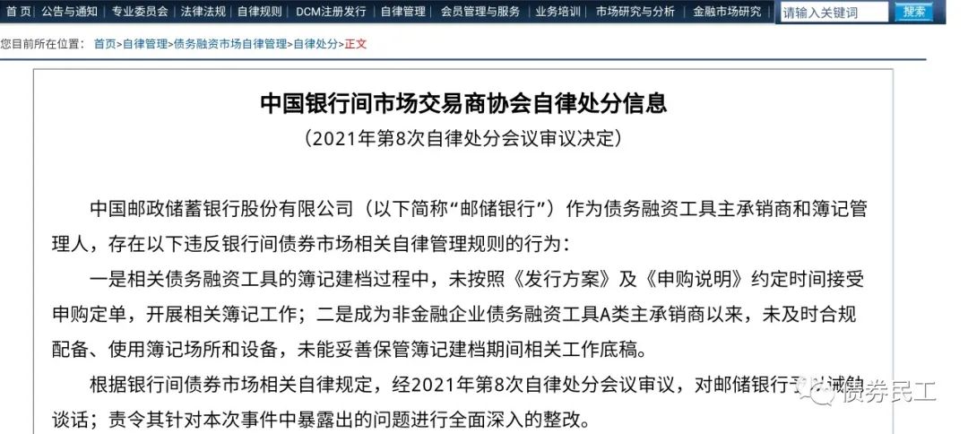 2020年以來,交易商協會加大了對中介機構,尤其是主承銷商的檢查和處分力度。2020年,交易商協會已經對興業銀行、中信證券、北京銀行、光大銀行、渤海銀行和寧波銀行等主承銷商進行了自律處分。2021年1月15日對中原銀行、光大銀行和興業銀行等主承銷商進行了自律處分,此次處分了郵儲銀行和浙商銀行。