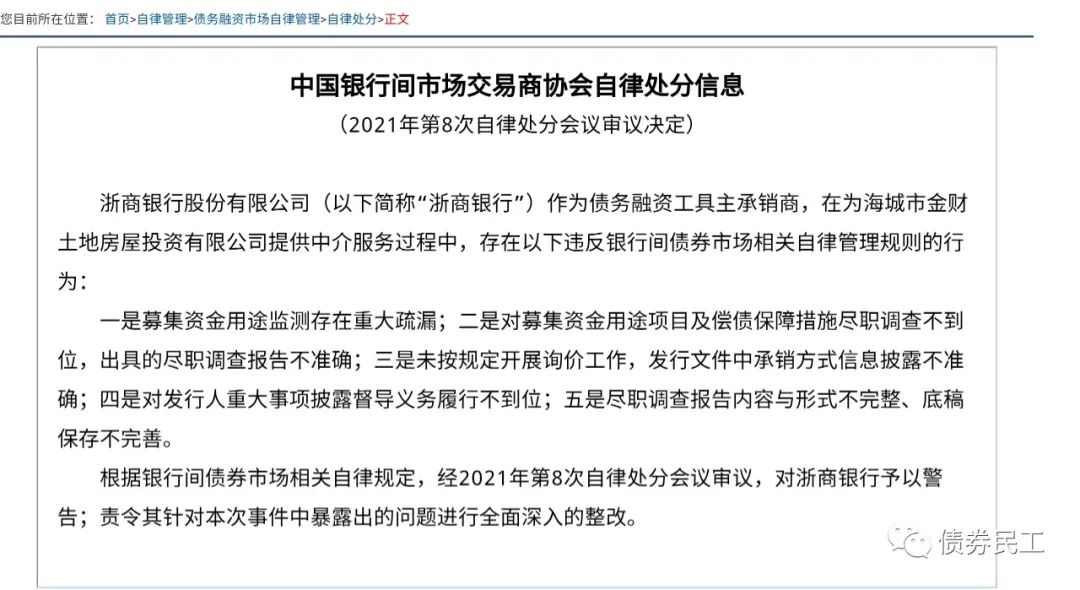 2021年6月18日,交易商協會同日對郵儲銀行和浙商銀行進行了自律處分,同時被自律處分的還有債券發行人海城市金財土地房屋投資有限公司(以下簡稱“海城金財”)。