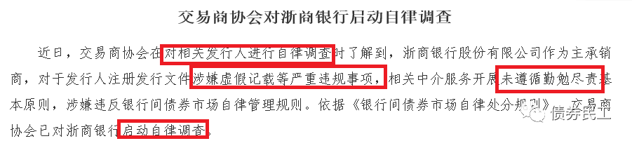 在此次自律處分之前,中國銀行間市場交易商協會于2021年4月6日公告,對浙商銀行啟動自律調查,主要原因是浙商銀行“對于發行人注冊發行文件涉嫌虛假記載等嚴重違規事項”,這次自律調查的起因是在“對相關發行人進行自律調查時”發現的,也就是線索可能直接來源于發行人。目前尚不清楚6月18日的這次自律處分的結果是否是交易商協會4月啟動自律調查的結果。