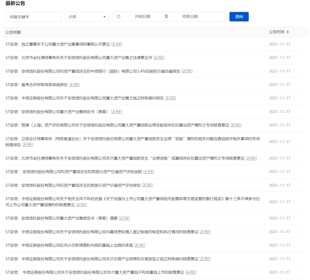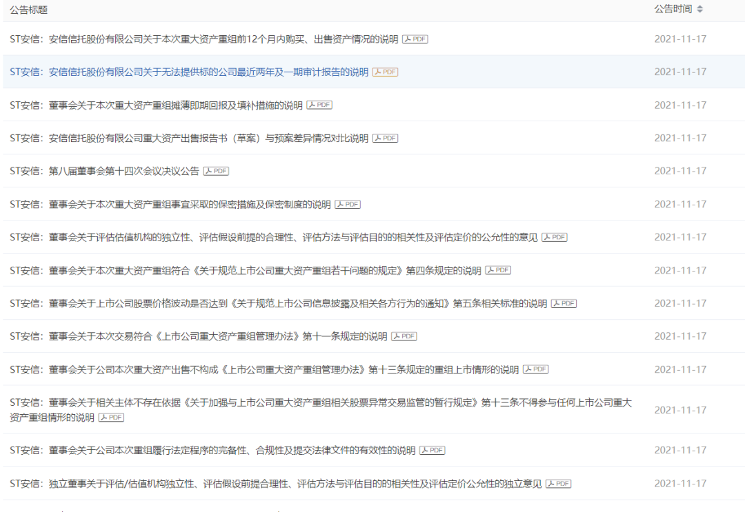 11月17日,安信信托再一次密集發(fā)布了45份公告,一系列公告推動(dòng)了股價(jià)漲停;也讓人對(duì)這45份公告表示好奇,究竟說(shuō)了什么?