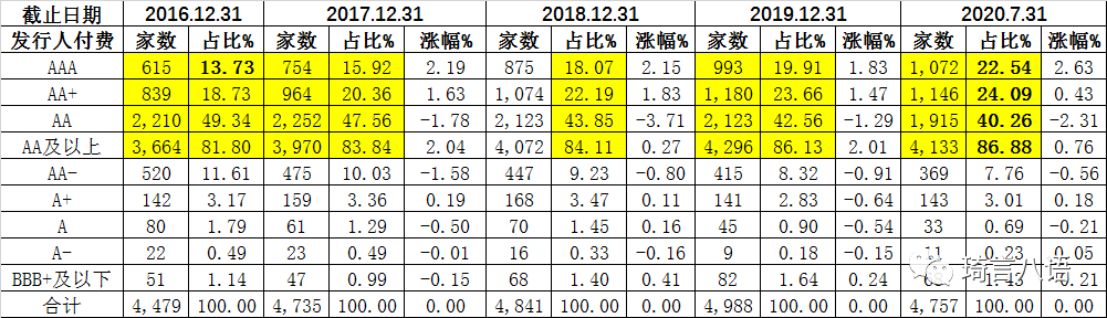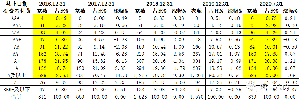 截至2020年7月31日,大公國際等發行人付費的外部評級機構的評級分布及變化情況如下: