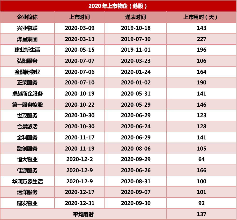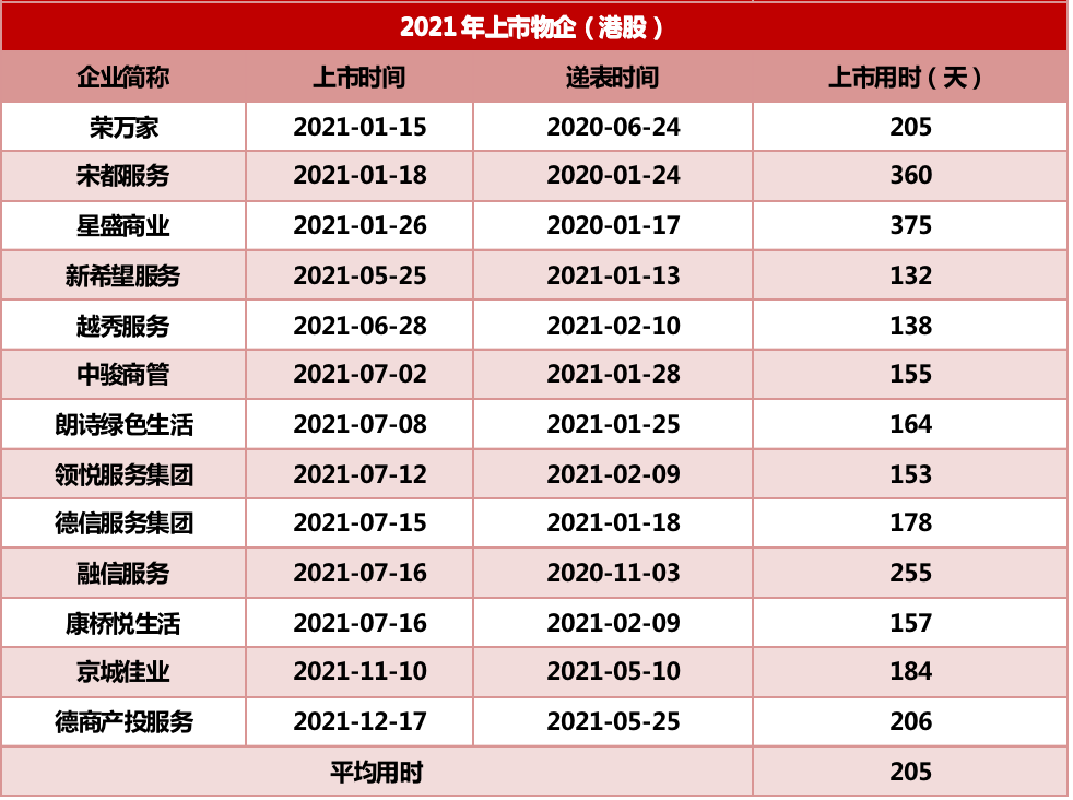 從審批節(jié)奏來看,物企獲批進度放緩,同比延后約68天。根據(jù)克而瑞物管和中物研協(xié)統(tǒng)計,2020年17家在港交所上市的物企從初次交表到成功上市平均歷時137天,而2021年上市的13家物企平均用時205天。