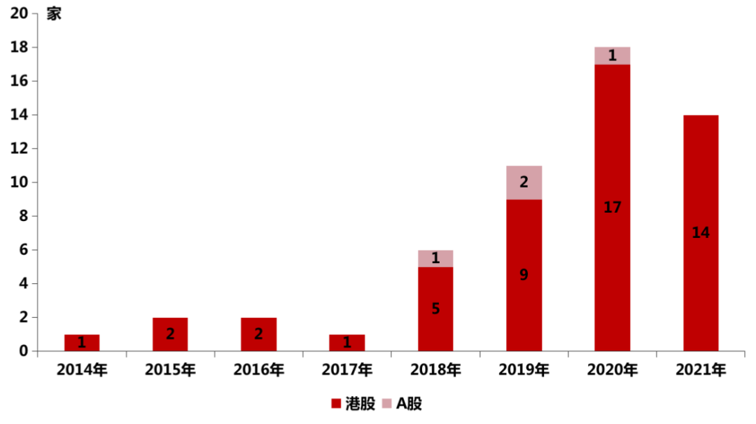 從遞表企業(yè)來看,2021年行業(yè)遞表物企數(shù)達34家,為迄今為止遞表企業(yè)最多的一年,但從實際推進進程來看,年內(nèi)遞表并成功上市的僅有9家。此外,年內(nèi)新增上市物企共14家(其中13家為常規(guī)IPO上市,均為港股物企),較上年18家減少4家,未及預(yù)期。