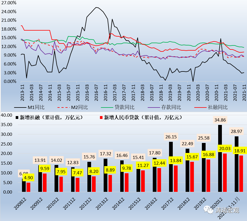 數據上看,今年11月M2同比與社融存量同比增速分別為8.50%和10.10%,前者環比下降0.20個百分點,后者環比上升0.10個百分點。近三個月,M2同比增速與社融存量同比增速的平均值分別為8.50%和10.03%,和11月的8.50%和10.10%比較接近,若要考慮穩增長相關政策的支撐作用,結構性寬信用的背景下,預計2022年M2與社融增速應分別會在8.50%與10.50%左右。