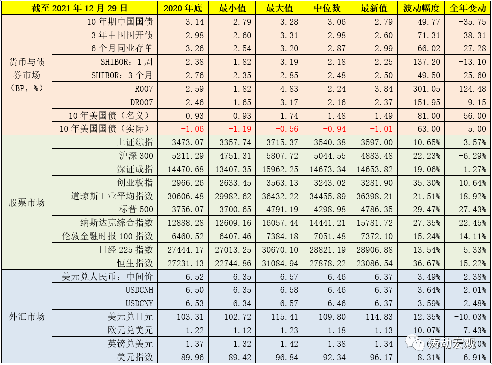 潮起潮落下,一切即將塵埃落定。回望2021年全年,應清醒地認識到,當前全球經濟只是反彈,還未真正復蘇,多數經濟體并未恢復到疫情前水平,一些問題的存在仍然讓人頭疼,如疫情起伏反復嚴重干擾復蘇進程、不同地區復蘇分化發展失衡威脅增長的可持續性、高企的通脹尚未出現緩解跡象(對企業和民眾的困擾需要引起關注),供應鏈產業鏈受阻的“隱患”仍在間歇性發作、新興經濟體和發展中國家對美聯儲政策節奏的變化憂心忡忡等等。過去這一年,雖然中國經濟總量即將邁入110萬億元大關、人均GDP將達到1.20萬美元(逼近高收入國家水準),但我們卻經歷了經濟基本面的倒“V”型反轉和下半年以來的超預期下行,經歷了A股市場近幾年以來表現最為一般的一年(雖然創業板仍在繼續大幅上行以及A股全年成交金額突破2015年的紀錄)以及恒指連續兩年的下挫,亦經歷了2015年以來人民幣匯率波動幅度最小的一年(全年不到4%)。同樣是這一年,美聯儲Taper進程明顯加快以及加息步伐預期明顯提前、美元指數與美債收益率顯著上行、美國三大股指引領全球,中國與美國之間的第二階段博弈在Biden時代的第一年迎來了新的特征以及地緣政治格局博弈愈加劇烈。依然是這一年,我們看到雖然中國經濟在疫情之后率先反彈,但在反彈之后經濟基本面亦比其它經濟體率先進入下行通道(今年1-3季度的當季GDP增速分別為5%、5.50%和4.90%),未來若干年的中國經濟可能均需要為保“5%”而不斷努力,年終政治局會議與中央經濟工作會議則相應提出“穩字當頭、穩住宏觀經濟大盤”的政策基調,并做出“需求收縮、供給沖擊、預期轉弱”的基本判斷,因為政策部門與市場均應認識到,經濟基本面的運行是有慣性的且某種程度上不以人的意志為轉移,經濟增速一旦落下來,就很難再上去,所以現在要讓它落的慢一些、溫柔一些,從這個角度看持續收緊的貨幣環境應已很難重現。還是這一年,城投政策趨嚴與地產行業重塑牽動著整個市場的神經,綠色金融漸成氣候、碳貨幣趨勢愈發明顯,新三板、北交所、創業板與科創板正持續為科創類企業提供加持平臺。