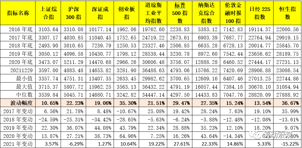 2、相較于2019-2020年的股市,2021年的股市表現整體一般,上證綜指略微上揚3.57%、滬深300下挫6.29%、創業板指上揚10.64%,成為表現最亮眼的A股板塊。同時美國三大股指繼續大幅上揚,但恒生指數已經連續兩年下行、分別下挫3.70%和15.22%。