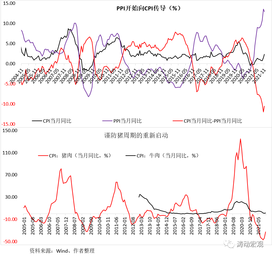 大宗商品價格上行導致生產成本處于高位是這一段時期以來的聚焦點,而11月數據顯示PPI與CPI之間的剪刀差在繼續擴大之后呈現出一定緩和的態勢,而PPI已經開始向CPI傳導。具體,今年11月當月,CPI同比已經連續兩個月回升至2.30%,PPI同比則進一步回落至12.90%但仍處在高位水平,這表明不僅生產端的成本壓力愈發突出,消費端的壓力實際上也開始體現。特別是,2022年需要對豬周期的反轉有一定心理準備。
