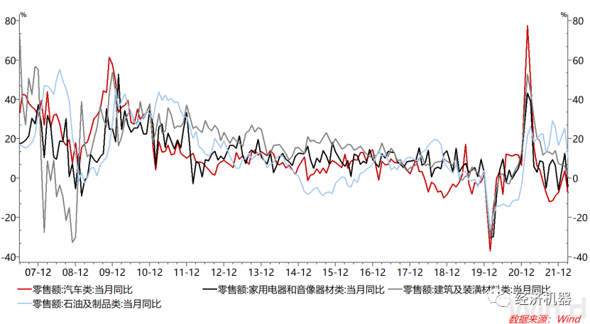 可選消費中家電、汽車降幅較大。家電及音像器材同比下跌4.3%,前值增長12.7%,下滑幅度最大;汽車類同比回落7.5%,前值增長3.9%;石油及制品同比增長10.5%,前值25.6%;建筑裝潢同比增長0.4%,前值增長6.2%