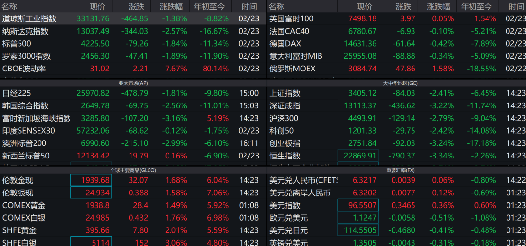 截至目前,美國三大股指均大幅下挫,道瓊斯工業(yè)指數(shù)下挫1.38%、納斯達克指數(shù)下挫2.57%、標普500指數(shù)下挫1.84%;日經(jīng)指數(shù)下挫2.07%,恒生指數(shù)下挫3.25%;中國股指受沖擊亦比較大,上證綜指下挫1.44%、深證成指下挫2.11%、滬深300下挫1.93%、創(chuàng)業(yè)板指數(shù)下挫2.18%。避險資產(chǎn)受追捧,市場對大宗商品價格上行預期亦比較充分,黃金價格大幅抬升,倫敦金現(xiàn)大幅抬升1.77%至1942美元/盎司,美元指數(shù)升至96.64,原油價格突破100。