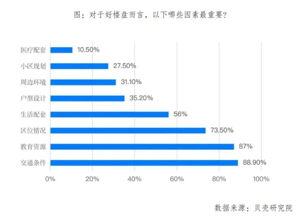 貝殼研究院曾發起新房“好房標準”調研,交通條件、教育資源及區位情況對置業的影響權重最高。