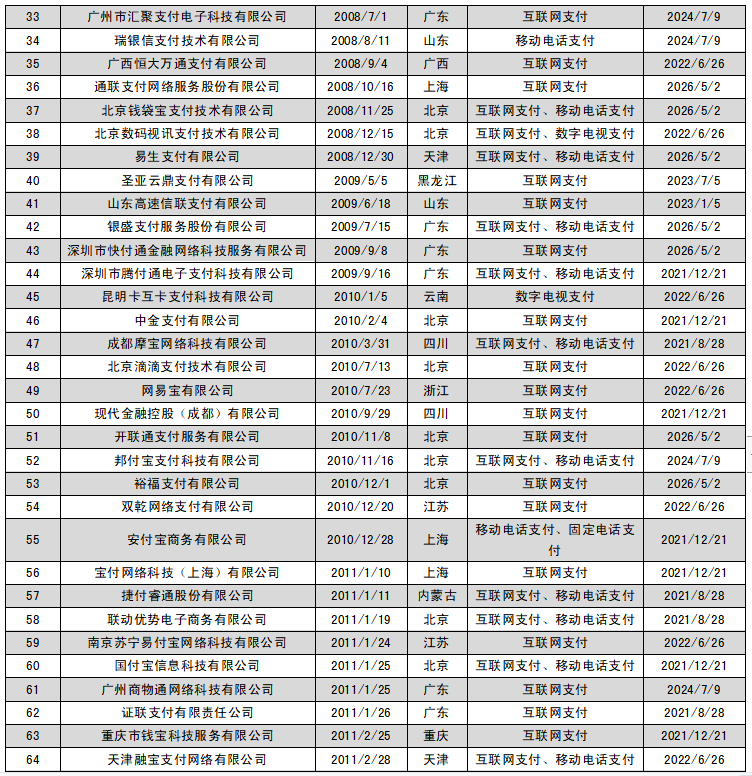 2021年5月13日,央行官網公布首批27張支付牌照續展結果,支付寶、財付通、銀聯商務、資和信、銀盛支付、通聯支付等24家支付機構全部通過續展。廣州銀聯網絡支付有限公司、北京數字王府井科技有限公司、北京銀聯商務有限公司擬與其控股股東銀聯商務股份有限公司開展整合工作,向人民銀行提交了中止續展審查申請,在中止審查期間繼續開展業務。