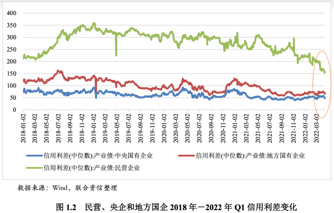 自2018年以來,民營企業(yè)債券凈融資額的變化以及其與國企的差異反映出其整體在外部融資環(huán)境的負(fù)面沖擊下,所面臨的融資難困境。2018年-2022年1季度,民企債券凈融資額除2020年上半年和2022年一季度短暫為正外,其余季度均為負(fù)值,特別是各年的下半年,民企凈融資額負(fù)值均較大;而同期國企凈融資額均為正值,特別是民企為正值時,國企凈融資更高,兩者分化進(jìn)一步加劇。這說明市場整體環(huán)境較差、外部融資環(huán)境負(fù)面沖擊較大時,民企融資非常困難;市場環(huán)境放松時,民企融資雖然好轉(zhuǎn),但從獲利力度上不如國企。