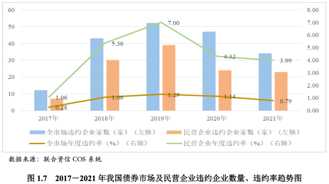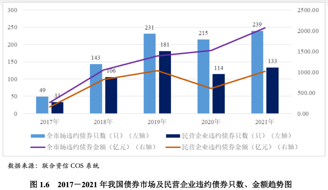 盡管政府后續(xù)采取了一系列措施以緩解民營企業(yè)的流動性困境,但民營企業(yè)的信用狀況未得到明顯改善,加之始自2019年底的新冠疫情對企業(yè)的正常經(jīng)營形成重大沖擊,使得2019-2021年民營企業(yè)的債券違約保持高位運(yùn)行,且占據(jù)違約債券的大部分,詳見下圖。
