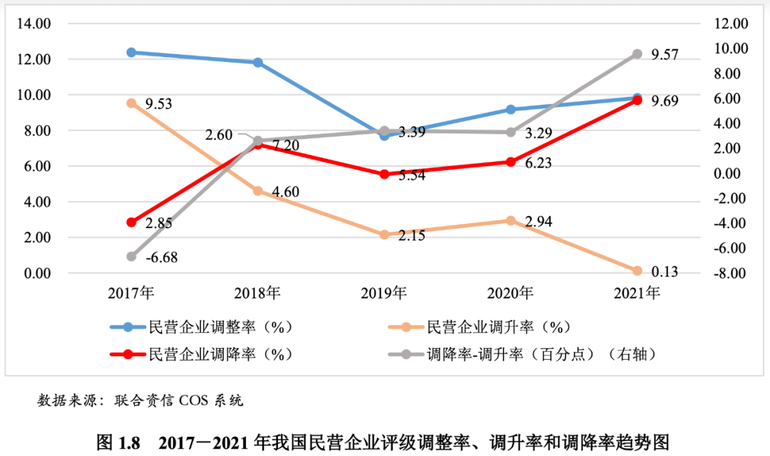 自2018年以來,民營企業(yè)的信用評級變化反映出其整體信用能力不斷弱化,信用評級機(jī)構(gòu)通過評級調(diào)整對民營企業(yè)的違約風(fēng)險進(jìn)行了提示和預(yù)警。從評級調(diào)整看,2017-2021年間,民營企業(yè)的評級調(diào)整率先降后升,評級調(diào)升率整體呈下行趨勢,而評級調(diào)降率則整體呈上升趨勢。與整個債券市場相比,民營企業(yè)的評級調(diào)整率明顯高于債券市場總體,評級調(diào)升率整體低于債券市場總體,評級調(diào)降率則顯著高于債券市場總體。2017年,民營企業(yè)的評級調(diào)升率尚高于評級調(diào)降率6.68個百分點(diǎn),但自2018年發(fā)生逆轉(zhuǎn),其評級調(diào)降率顯著高于評級調(diào)升率,直至2021年評級調(diào)降率高于評級調(diào)升率9.57個百分點(diǎn),見圖1.8。