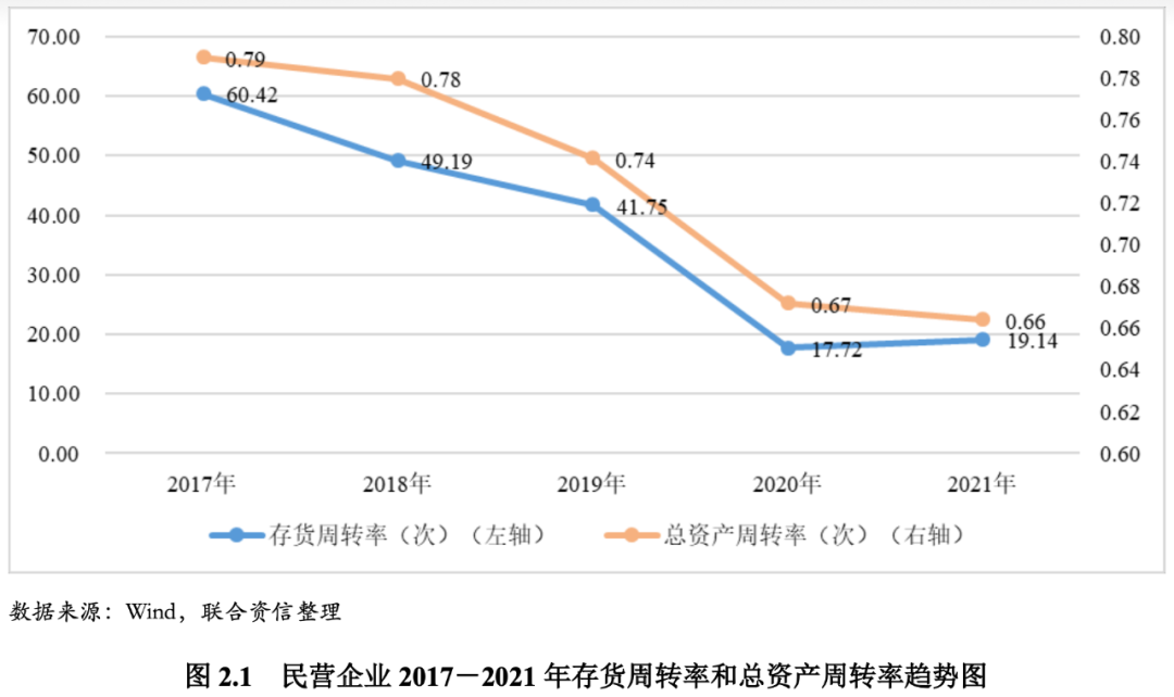 2018年以來,民營企業(yè)的經(jīng)營效率整體呈下行走勢。從樣本企業(yè)的存貨周轉(zhuǎn)率均值來看,2018-2020年同比分別下降11.23次、7.44次和24.03次,反映出民營企業(yè)銷售不暢,存貨積壓較為嚴(yán)重。2021年我國經(jīng)濟(jì)從疫情中快速復(fù)蘇,民營企業(yè)的存貨周轉(zhuǎn)率有所反彈,同比上升1.42次,但相比2017年仍處于底部區(qū)域。從樣本企業(yè)的總資產(chǎn)周轉(zhuǎn)率均值看,2018-2021年間呈持續(xù)下行趨勢,其中2019年和2020年降幅較為明顯,分別下降0.04次和0.07次??傮w來看,自2018年以來,在信用環(huán)境、新冠疫情、供應(yīng)鏈不暢和全球經(jīng)濟(jì)復(fù)蘇乏力等因素沖擊下,我國民營企業(yè)的經(jīng)營效率下降較為顯著,目前仍在底部區(qū)域徘徊。今年由于新冠疫情的散發(fā)和多發(fā),我國各地加強(qiáng)了封控和管控措施,部分民營企業(yè)被迫停工停產(chǎn),經(jīng)營效率可能進(jìn)一步下行。
