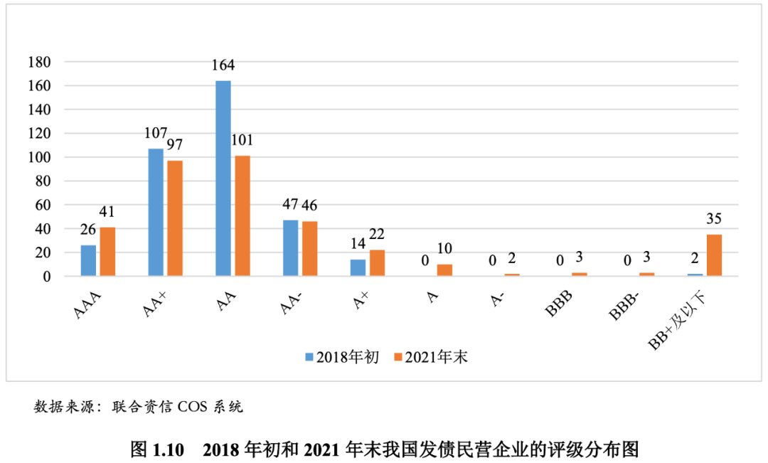從評級分布看,2021年末與2018年初相比,民營企業(yè)的評級分布整體向右偏移,高信用級別企業(yè)占比下降,而低信用級別企業(yè)占比顯著上升,具體為:AAA級占比提升4.17個百分點(diǎn),源于期間部分優(yōu)質(zhì)頭部民企評級提升所致;AA+級占比下降2.78個百分點(diǎn),源于向上或向下遷移所致;AA級占比大幅下降17.50個百分點(diǎn),該等級民營企業(yè)受到的流動性沖擊較大,導(dǎo)致信用惡化后評級下調(diào)數(shù)量較多;BB+級及以下占比大幅上升9.17個百分點(diǎn),部分民營企業(yè)由于流動性沖擊信用能力惡化,被降至投資級以下甚至出現(xiàn)債務(wù)違約。而同期整個債券市場的評級分布則變化不大,仍整體呈左偏分布,AAA級和AA+級占比均有所上升,AA級和AA-級占比有所下降,BB+級及以下占比上升約2個百分點(diǎn),總體分布略向右有所偏移。因此,評級分布反映出整個債券市場受評主體的信用能力略有弱化,但民營企業(yè)的信用能力則出現(xiàn)顯著弱化。