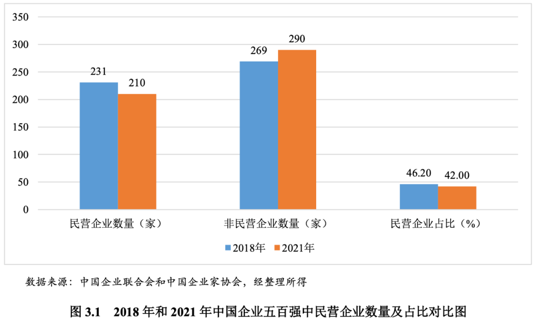 我們采用中國企業(yè)聯(lián)合會和中國企業(yè)家協(xié)會聯(lián)合發(fā)布的中國企業(yè)五百強(qiáng)名單,通過對比分析民營企業(yè)2021年和2018年在五百強(qiáng)名單中的數(shù)量占比和排名變化來分析其整體市場競爭力的變化。2018年,中國企業(yè)五百強(qiáng)名單中有231家民營企業(yè),所占比例為46.20%;2021年,中國企業(yè)五百強(qiáng)名單中民營企業(yè)為210家,減少21家,所占比例為42.00%,下降4.20個百分點(diǎn),由此可見民營企業(yè)的整體市場競爭地位有所下降。從排名看,與2018年相比較,2021年有87家民營企業(yè)的排名上升,但有144家民營企業(yè)排名下降,其中63家民營企業(yè)退出了五百強(qiáng)名單,民營企業(yè)的市場地位總體上出現(xiàn)明顯下降。在2018年中國企業(yè)五百強(qiáng)中,有36家企業(yè)發(fā)生債務(wù)違約,其中民營企業(yè)28家,占比超過四分之三;發(fā)生債務(wù)違約的28家民營企業(yè),有18家退出五百強(qiáng)名單,7家排名下降,僅3家排名上升,可見債務(wù)危機(jī)是導(dǎo)致民營企業(yè)市場地位下降的重要原因之一。