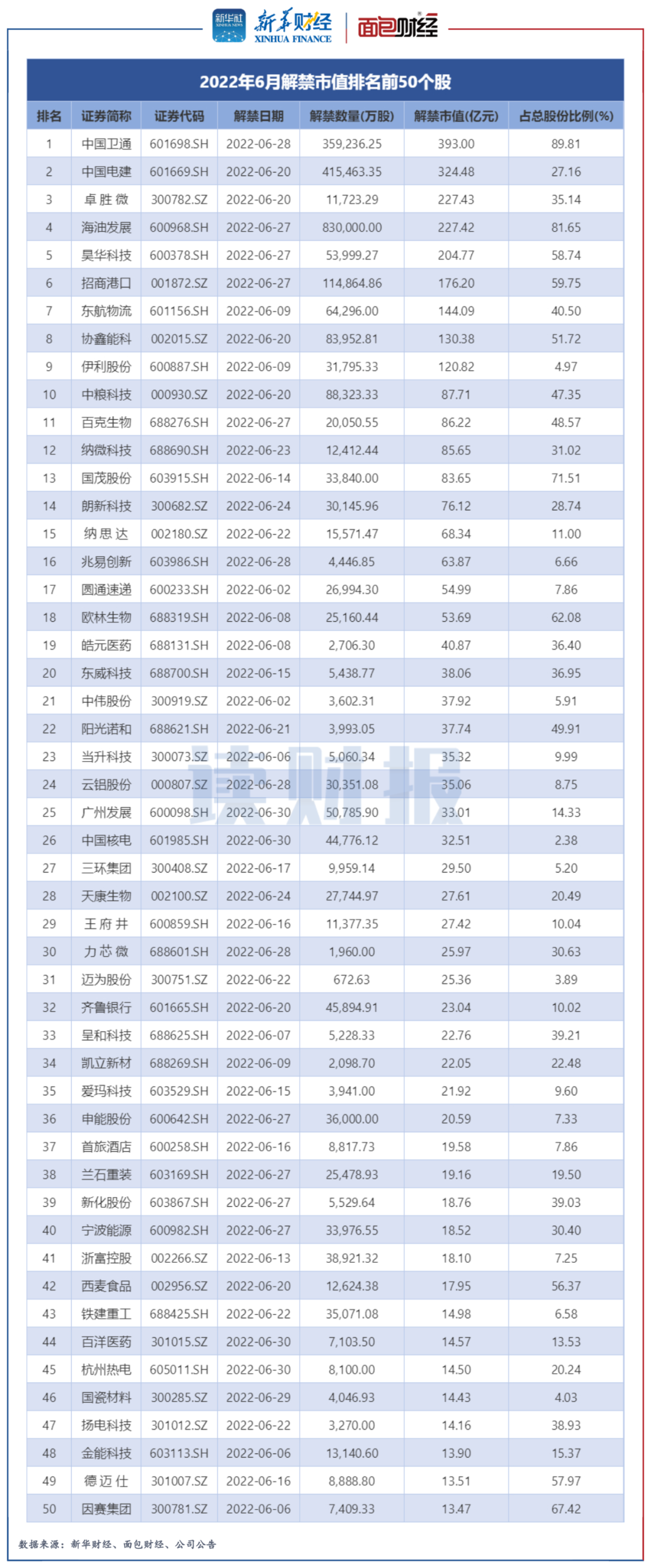圖2:2022年6月解禁市值排名前50個股