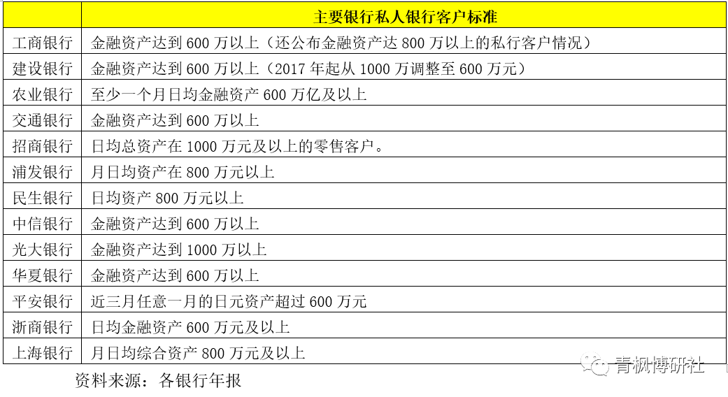 (1)工行、農(nóng)行、交行、平安銀行、中信銀行以及浙商銀行的私人銀行客戶標(biāo)準(zhǔn)是日均金融資產(chǎn)在600萬(wàn)元(含)以上。