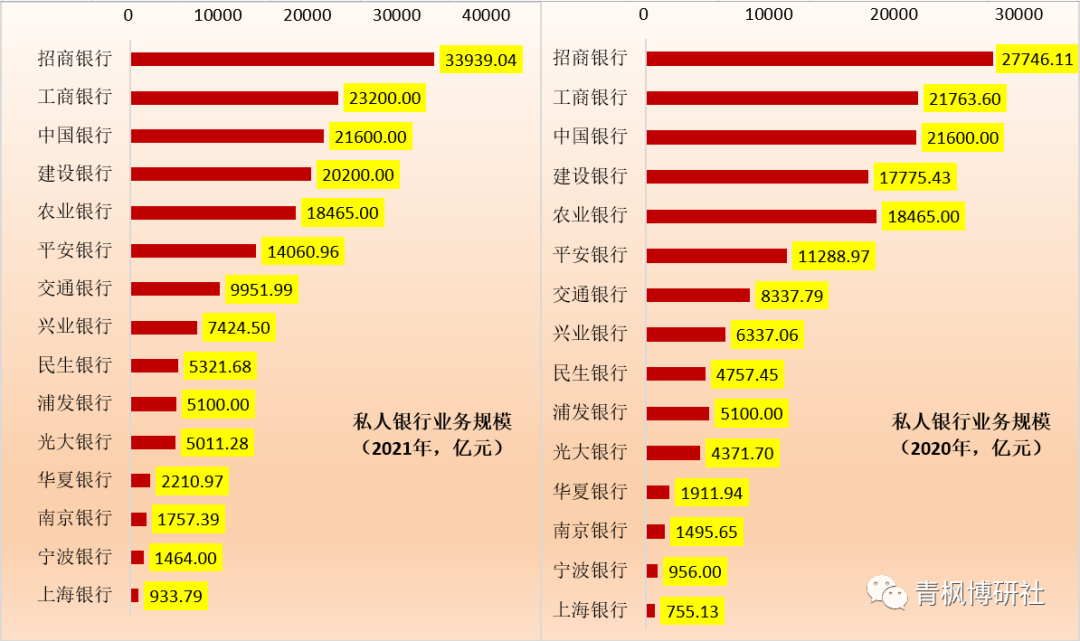 (1)寧波銀行與上海銀行披露了其2021年底的私人銀行管理資產(chǎn)規(guī)模分別為1464億元和934億元,是城商行中私行業(yè)務(wù)規(guī)模最大的兩家銀行。