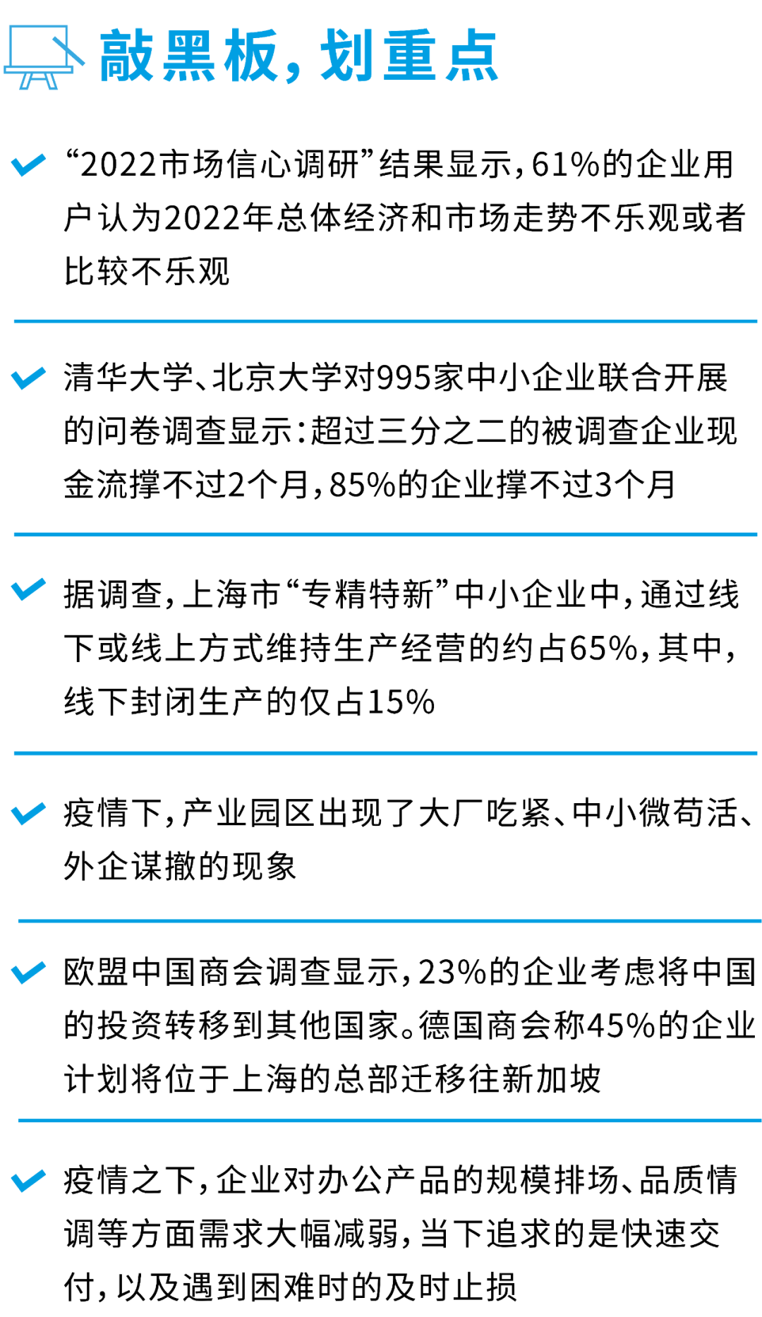根據(jù)上海市經(jīng)信委主任在新聞發(fā)布會(huì)上公布的數(shù)據(jù),上海全市9000多家規(guī)模以上工業(yè)企業(yè)中,已復(fù)工4400多家,占比接近50%。但中小企業(yè)復(fù)工復(fù)產(chǎn)率還偏低,餐飲、文娛及維修、檢測、物流等生產(chǎn)性服務(wù)領(lǐng)域受疫情影響很大。據(jù)調(diào)查,全市“專精特新”中小企業(yè)中,通過線下或線上方式維持生產(chǎn)經(jīng)營的約占65%,其中,線下封閉生產(chǎn)的僅占15%。