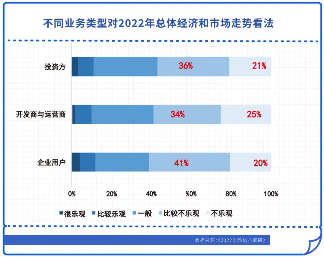 “2022市場信心調(diào)研”結(jié)果顯示,疫情加重企業(yè)生存壓力,61%的企業(yè)用戶認(rèn)為2022年總體經(jīng)濟(jì)和市場走勢不樂觀或者比較不樂觀,占比最高,其次為開發(fā)商與運(yùn)營商,有34%認(rèn)為比較不樂觀,25%認(rèn)為不樂觀,合計(jì)占59%。