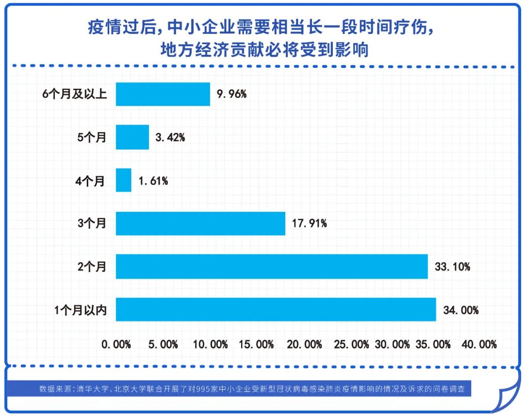 近三成受訪企業(yè)表示疫情對營業(yè)收入的影響將在50%以上。近半數(shù)企業(yè)表示今年?duì)I收至少下降20%。疫情過后,中小企業(yè)需要相當(dāng)長一段時(shí)間療傷,地方經(jīng)濟(jì)貢獻(xiàn)必將受到影響。