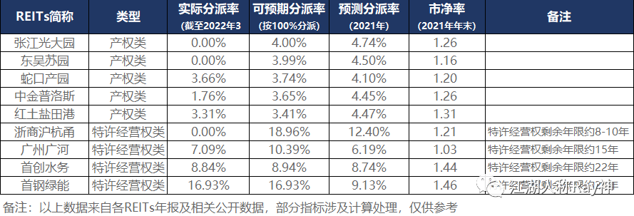 目前已經發行的12個公募REITs里,產權類的和特許經營權類的各占一半。從第一批那9個REITs已經披露的年報來看,產權類的REITs分派率顯然是低于特許經營權類的。并且,即便按FAD進行100%分派來計算的股息率,產權類的REITs表現都仍不及預測目標;與之相反的是,特許經營權類的基本上全都超過了預測。
