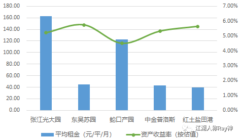 對于依托租金收益的產權類REITs,我們可以先簡單地從租金的維度上進行比較。目前的所有公募REITs里張江光大園的租金水平是最高的,平均租金達5.35元/平/天;其次是蛇口產園122.85元/平/月。那是不是他們的運營能力比別家都要強呢?其實未必,畢竟這兩家的資產是在上海和深圳,租金高一些似乎是情理之中的。如果我們把幾個REITs的資產收益率都算一下,就會發現恰恰這兩家的資產收益率比其他幾家都要低。