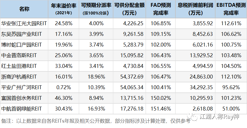 那么,面對實體經濟的壓力山大,這些投資于相關基礎設施的REITs的業績真的都有這么好嗎?首先,值得肯定的一點是首批發行的9個REITs在2021年的可供分配金額(FAD)基本上都超過了招募時的預測目標,息稅折攤前利潤(EBITDA)完成率也大多能夠達標。
