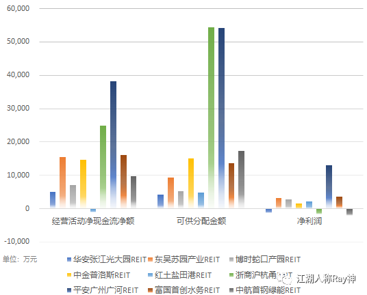 那么,如果我們再看看他們最終的凈利潤表現呢?這的確是可以輔助評判的一個維度。不過,通過財務報表你可能會發現有好幾個REITs的凈利潤是虧損的。即便是那些盈利的REITs,也有人是依靠退稅等因素把利潤拉上去,比如中金普洛斯。這主要是因為凈利潤受到了折舊攤銷的影響,短期賬面上出現虧損并不奇怪,所以關鍵還是要看現金流是否健康——這也是為什么凈利潤虧損的REITs還能夠進行分紅的原因。不過,作為進入REITs的成熟資產,如果長期虧損那還是需要慎重地加以審視的。