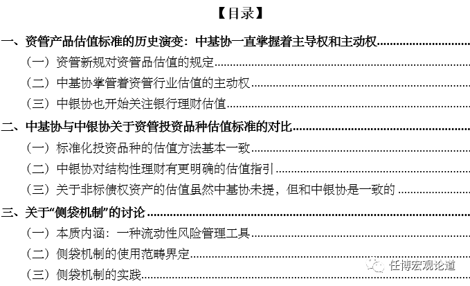 2、資管新規(guī)與理財新規(guī)發(fā)布后, 中銀協(xié)也開始深入到銀行理財估值標準的實踐中,分別于2019年8月5日發(fā)布了《商業(yè)銀行理財產品核算估值指引(征求意見稿)》、2020年9月8日成立了“理財會計與估值”工作組、2020年8月20日發(fā)布了《理財產品會計核算指引(試行)》(征求意見稿),這意味著證監(jiān)和銀保監(jiān)兩大體系,在估值的問題上既在爭取主動權,亦趨于統(tǒng)一。