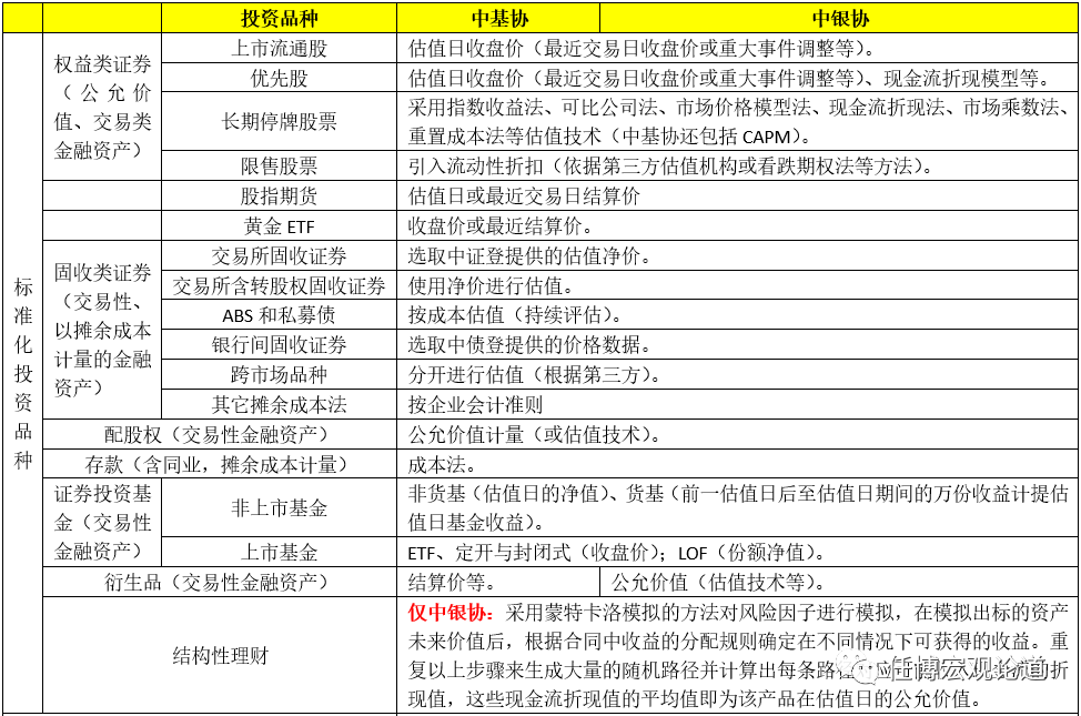 二、中基協(xié)與中銀協(xié)關于資管投資品種估值標準的對比