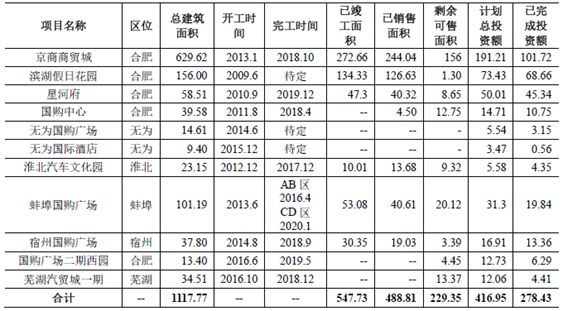 (3)、公司土儲分布問題較大,區域集中度高、單一項目占比太高。上面有關短期償債能力的分析雖然已經可窺一二,但可能并不足以讓投資者下定必賣之決心;換句話說,即使財務上流動性壓力比較大,公司是否能實現債務的繼續滾動或者處置資產以盤活流動性呢?其實財務上的反映已經比較滯后,如果仔細看公司的存貨和投資性房地產,可能會發現更大的問題。17年底時,公司土儲約678萬平,看起來并不少,但未開發的只有158萬平,而且絕大多數位于合肥市,結合后面的在建項目、在售項目詳情可知,公司最大的房產項目就是位于合肥的京商商貿城,太過于集中。