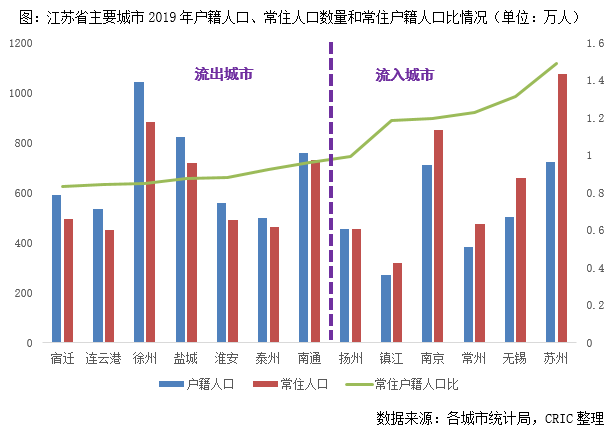 細(xì)化到單個城市來看,蘇北城市人口基數(shù)相對較大,徐州、鹽城2019年戶籍人口總量基本都在800-1000萬人,屬整個江蘇省城市前列,而宿遷、連云港、淮安人口優(yōu)勢也比較顯著,2019年戶籍人口總量也在500-600萬人,不過值得關(guān)注的是,雖然蘇北戶籍人口總量基數(shù)較大,但外溢嚴(yán)重,蘇北五城的常住戶籍人口比均小于1,對本城的人口吸附力普遍較差。究其原因,主要與蘇南、蘇北的經(jīng)濟(jì)差異,人口收入密切相關(guān),當(dāng)?shù)厝烁敢膺x擇去地理區(qū)位較近的上海、蘇南打拼,真正留在本地就業(yè)的相對較少。