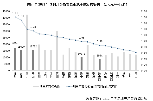 2020年下半年起蘇北五城“地王”頻出,徐州、鹽城和宿遷土地最高成交樓板價分別達(dá)到1.69萬元/平方米、1.58萬元/平方米和1.56萬元/平方米,已超過在售住宅均價。從我們認(rèn)為熱點區(qū)域土地供應(yīng)過少,輔以土地出讓底價的上升因素是本輪地價激增、地王頻出的主要原因,同時一級土地市場的高熱也強(qiáng)化了二級新房市場的樂觀預(yù)期。
