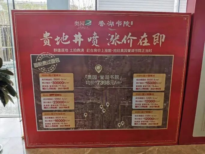 值得關(guān)注的是,蘇北部分城市在售樓盤也將周邊“地王”作為賣點,向客戶傳導(dǎo)房價上漲預(yù)期。譬如淮安的金輝優(yōu)步東郡、宿遷的奧園譽(yù)湖書院都在售樓處打出了類似標(biāo)識,房企“科普”地價驅(qū)動房價上漲預(yù)期,恐慌性購房現(xiàn)象在所難免。