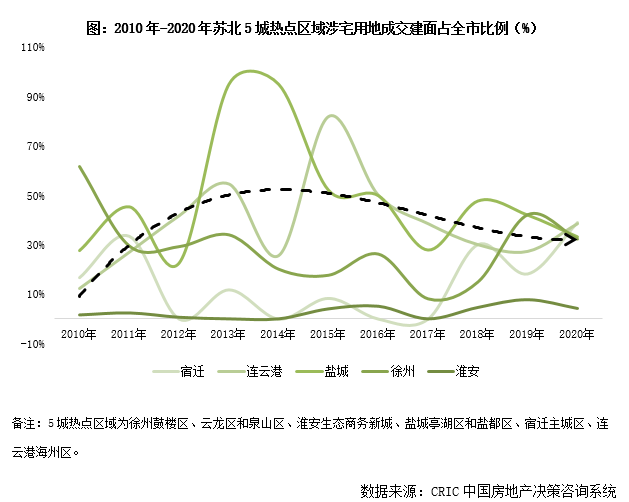 與全市土地市場充盈相反的是,熱點區(qū)域宅地供應(yīng)緊缺,近年5城土地供求有明顯向城市外延的郊縣傾斜的趨勢。以已出現(xiàn)“萬元地”的徐州鼓樓區(qū)、云龍區(qū)和泉山區(qū)、淮安生態(tài)商務(wù)新城、鹽城亭湖區(qū)和鹽都區(qū)、宿遷主城區(qū)等區(qū)域和連云港市府所處的海州區(qū)為蘇北5城熱點區(qū)域。從涉宅用地成交建面占比來看,5城熱點區(qū)域占比2015年后呈降低趨勢,至2020年占比均低于4成。其中淮安生態(tài)商務(wù)新城涉宅用地成交僅占全市總建面不足5%,徐州2020年云龍區(qū)僅出讓4宗涉宅用地。故,熱點區(qū)域宅地供不應(yīng)求是蘇北5成普遍存在的共性特征。