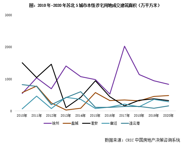 事實上,近五年蘇北5城土地成交規(guī)模維持較高規(guī)模,合計年均超2000萬平方米。以5城市本級為范圍限定,2018年后5城涉宅用地成交規(guī)模較2015年以前略有下降,但合計年成交規(guī)模仍超2000萬平方米。不同區(qū)域存在顯著的差異:宿遷、連云港自2013-2014年高點之后,便開啟低位徘徊;鹽城、淮安回調(diào)幅度不及宿遷、連云港,年成交量分別在500萬方和300萬方高位持穩(wěn),徐州土拍放量最為明顯,即便2017年成交縮量,也高位持穩(wěn)1000萬平方米。