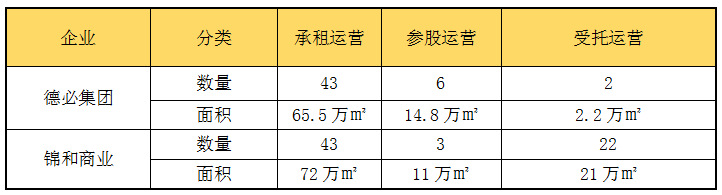 兩家公司的經營模式主要包括“承租運營”、“參股運營”和“受托運營”三種模式。截至2021年上半年,德必集團三種模式下的經營項目分別為43個、6個、2個,錦和商業分別為43個、3個、22個。