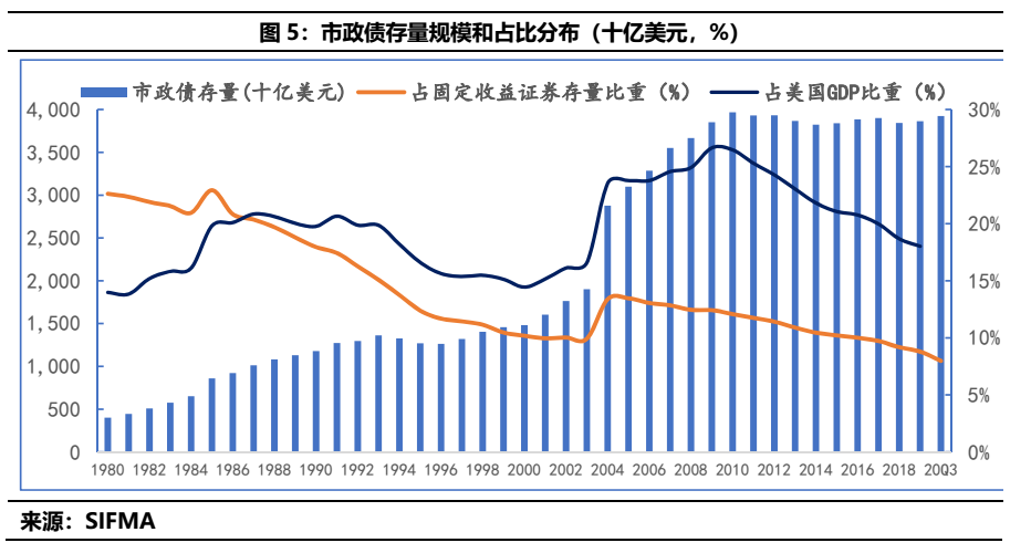 2)其次,我們介紹了當下市政債的定義以及20世紀80年代以來美國市政債的規模和現狀分析:絕對規模的相對穩定和相對規模漸漸下滑,似乎是去城市化和工業化到了一定進度上的體現,但仍扮演者極為重要的角色。