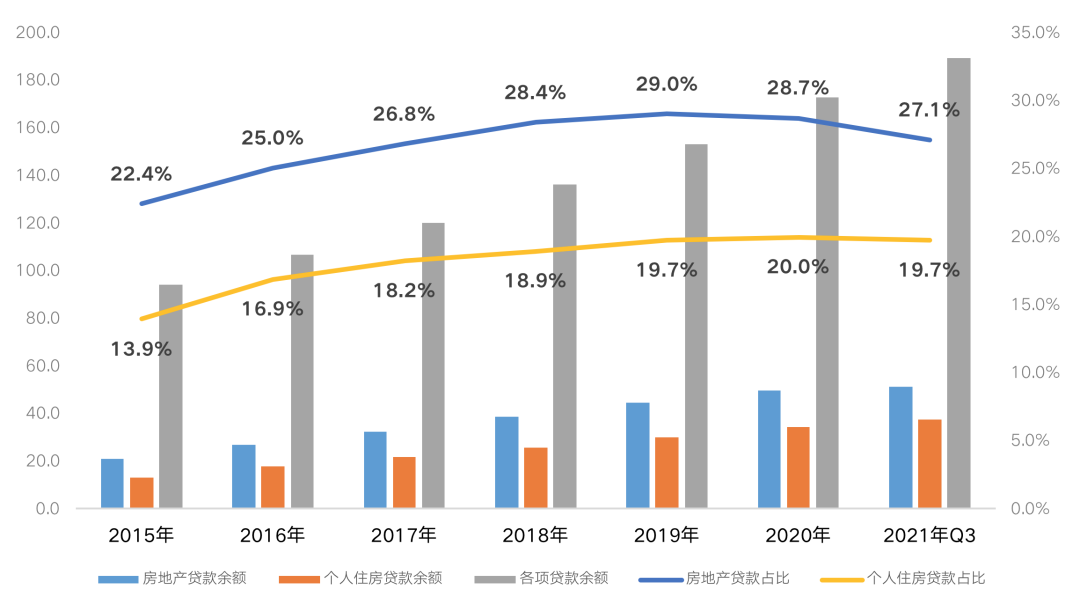 從各項貸款占比來看,2021年三季度末,全國房地產貸款余額占各項貸款余額的比重進一步回落至27.1%,較2020年末再降1.6個百分點。其中,個人住房貸款余額占各項貸款余額的比重跌至19.7%,較2020年末減少0.3個百分點。