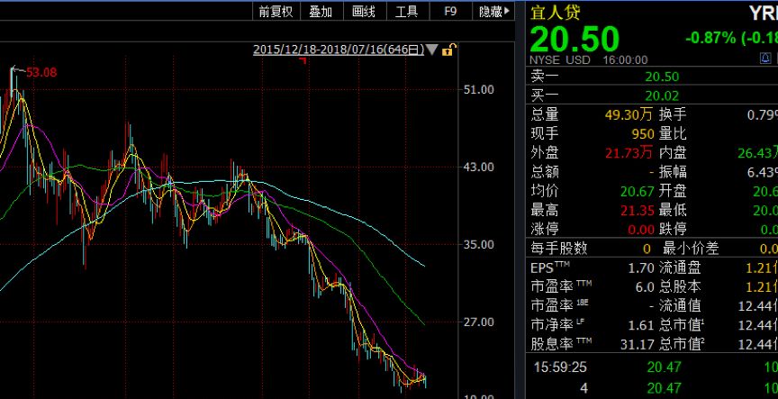 截至2018年7月16日宜人貸股價為20.50美元,相比2017年10月19日53.8美元下跌61.9%。股價走勢截圖如下: