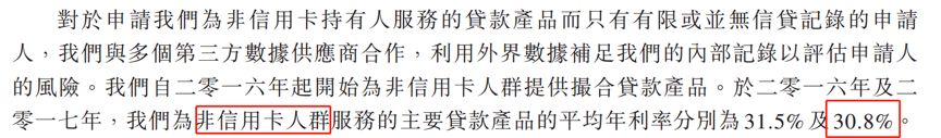 2016年和2017年,為“非信用卡人群服務的主要貸款產品的平均年化利率分別為31.5%及30.8%”。招股書原文如下: