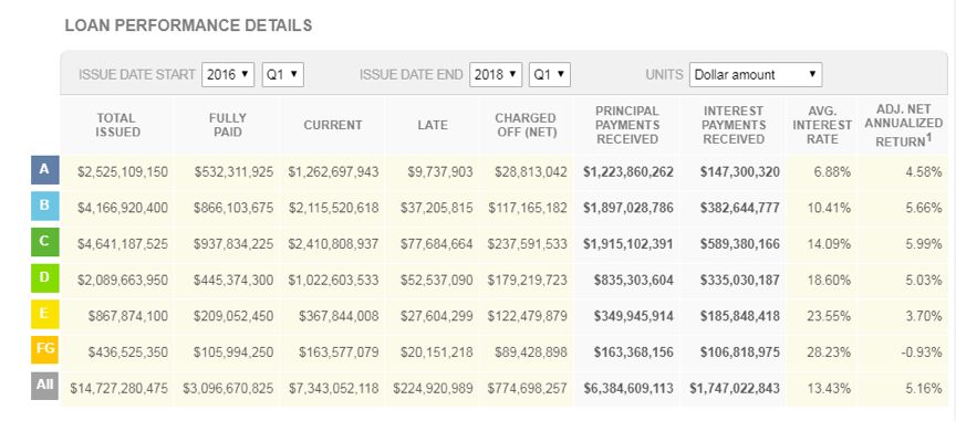 2015年到2018年一季度,LendingClub的最后一季度所有等級的貸款平均利率為13.34%。而期間LendingClub貸款實際損失大約在5.26%左右,投資人總體回報為5.16%。