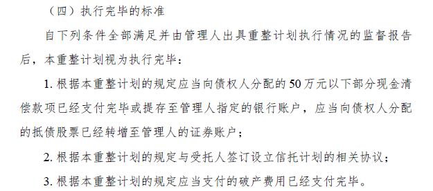 后者河北高院則不認可按照二級市場的股價來計算債權人實際清償率的方式, 其從重整計劃記載100%的清償率以及重整計劃已執行完畢的角度來論證“債權因在破產重整程序中得到100%清償而消滅”。