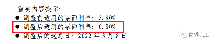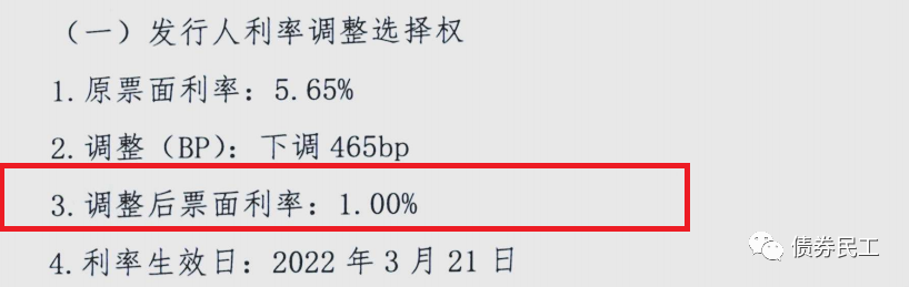 在此之前,債券民工關(guān)注到的票面利率調(diào)整最低的是某城投公司的中期票據(jù),3+2年期的債券在行權(quán)時(shí),將后2年的票面利率調(diào)整為1%。